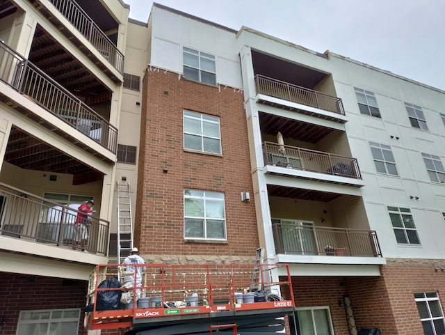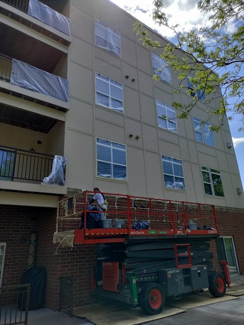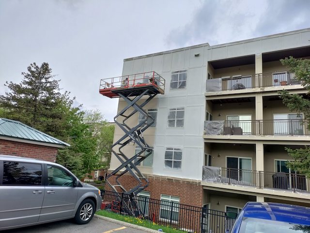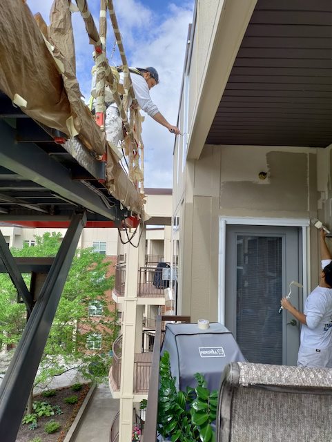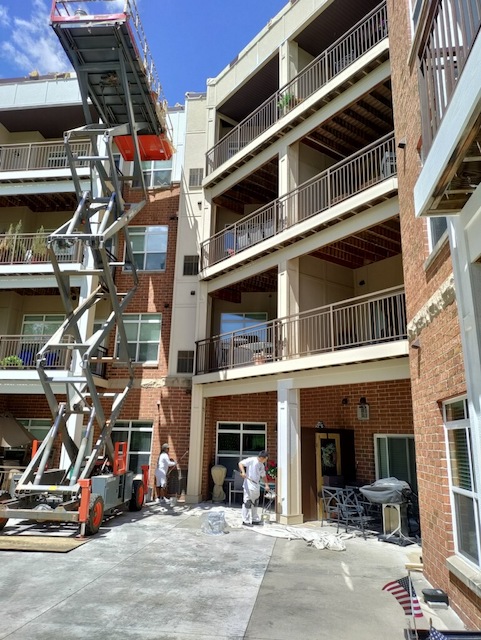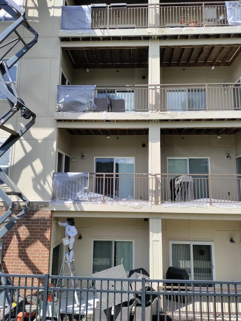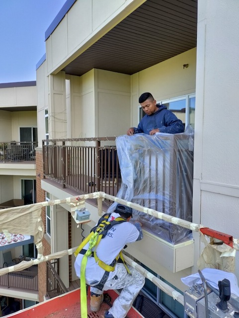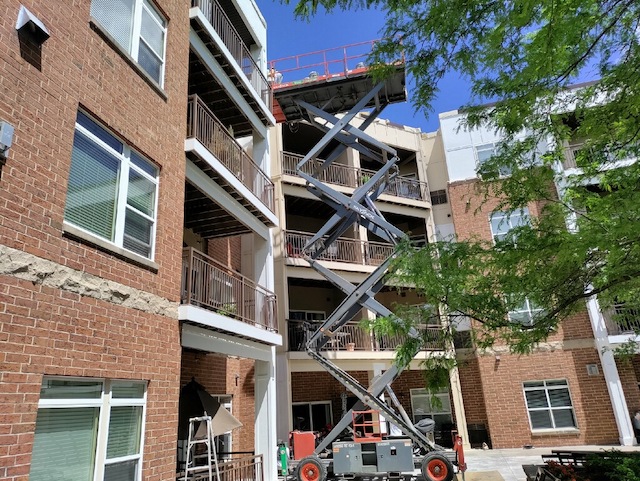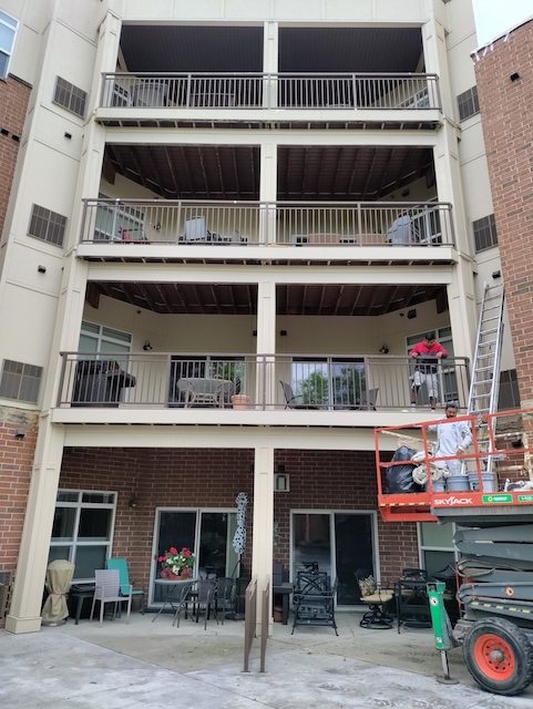 The crew is continuing to work diligently on your project. Today they are doing more lift work to prep and paint the railings around your building.